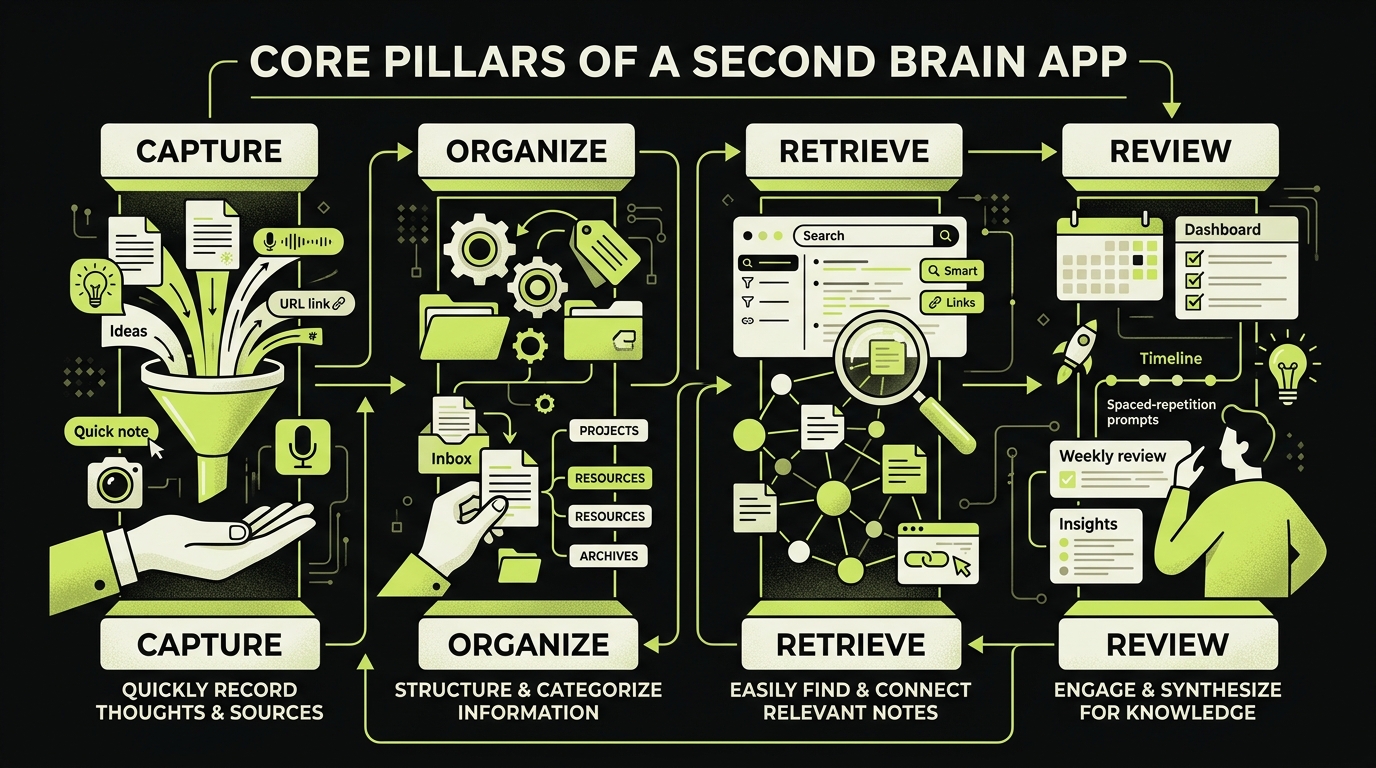 The phrase "second brain app" gets used loosely — sometimes for note-taking tools, sometimes for AI summarizers, sometimes for read-later apps. But the concept has a more specific origin. Productivity author Tiago Forte popularized the framework: a second brain is a dedicated external memory system designed to capture ideas, save resources, and connect knowledge so your biological brain doesn't have to hold everything at once.