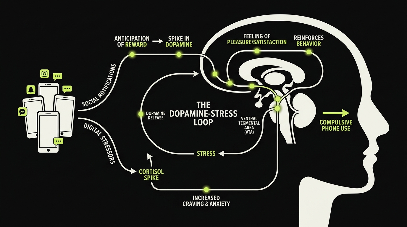 Pour comprendre pourquoi le stress des réseaux sociaux est si courant, il faut regarder du côté de la neuropsychologie. Les plateformes sociales sont conçues pour activer le circuit de récompense dopaminergique du cerveau — le même système qui régule la faim, le plaisir ou la motivation.
