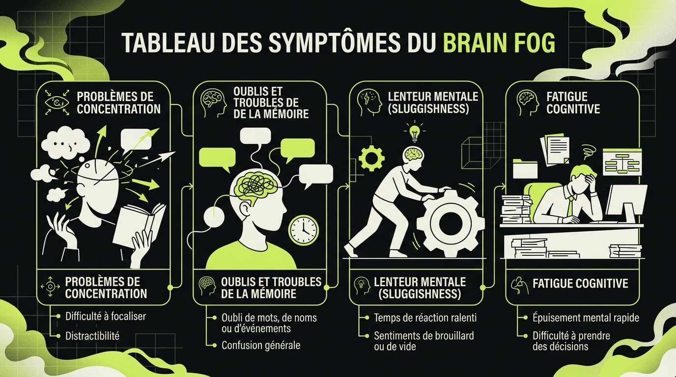 - Ses symptômes principaux sont : difficulté de concentration, mémoire défaillante, lenteur mentale et fatigue cognitive disproportionnée.