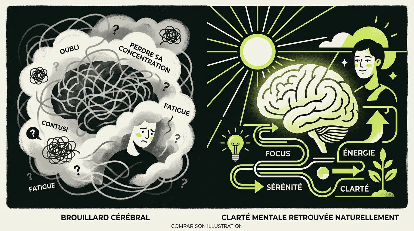 Le brouillard cérébral traitement naturel est une recherche qui explose — et pour cause. Difficultés de concentration, pensées floues, fatigue cognitive qui ne cède pas malgré le repos : ces symptômes touchent aujourd'hui une large part de la population active. Pourtant, le brain fog n'est pas une maladie en soi. C'est un signal d'alarme que le cerveau envoie lorsque ses ressources sont épuisées.